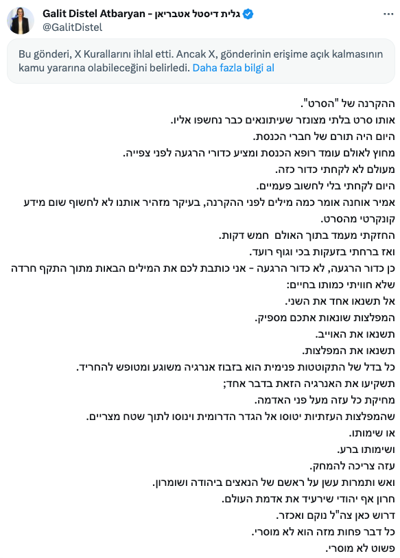 İsrail Milletvekili Galit Distel Atbaryan, sosyal medya hesabı üzerinden Gazze'nin yeryüzünden silinmesi gerektiğini söyledi. Ayrıca Filistinlilerii, Nazilere benzetti...