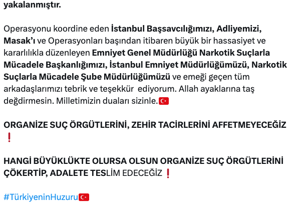 Operasyonu koordine eden İstanbul Başsavcılığımızı, Adliyemizi, Masak’ı ve Operasyonları başından itibaren büyük bir hassasiyet ve kararlılıkla düzenleyen Emniyet Genel Müdürlüğü Narkotik Suçlarla Mücadele Başkanlığımızı, İstanbul Emniyet Müdürlüğümüzü, Narkotik Suçlarla Mücadele Şube Müdürlüğümüzü ve emeği geçen tüm arkadaşlarımızı tebrik ve teşekkür ediyorum. Allah ayaklarına taş değdirmesin. Milletimizin duaları sizinle.